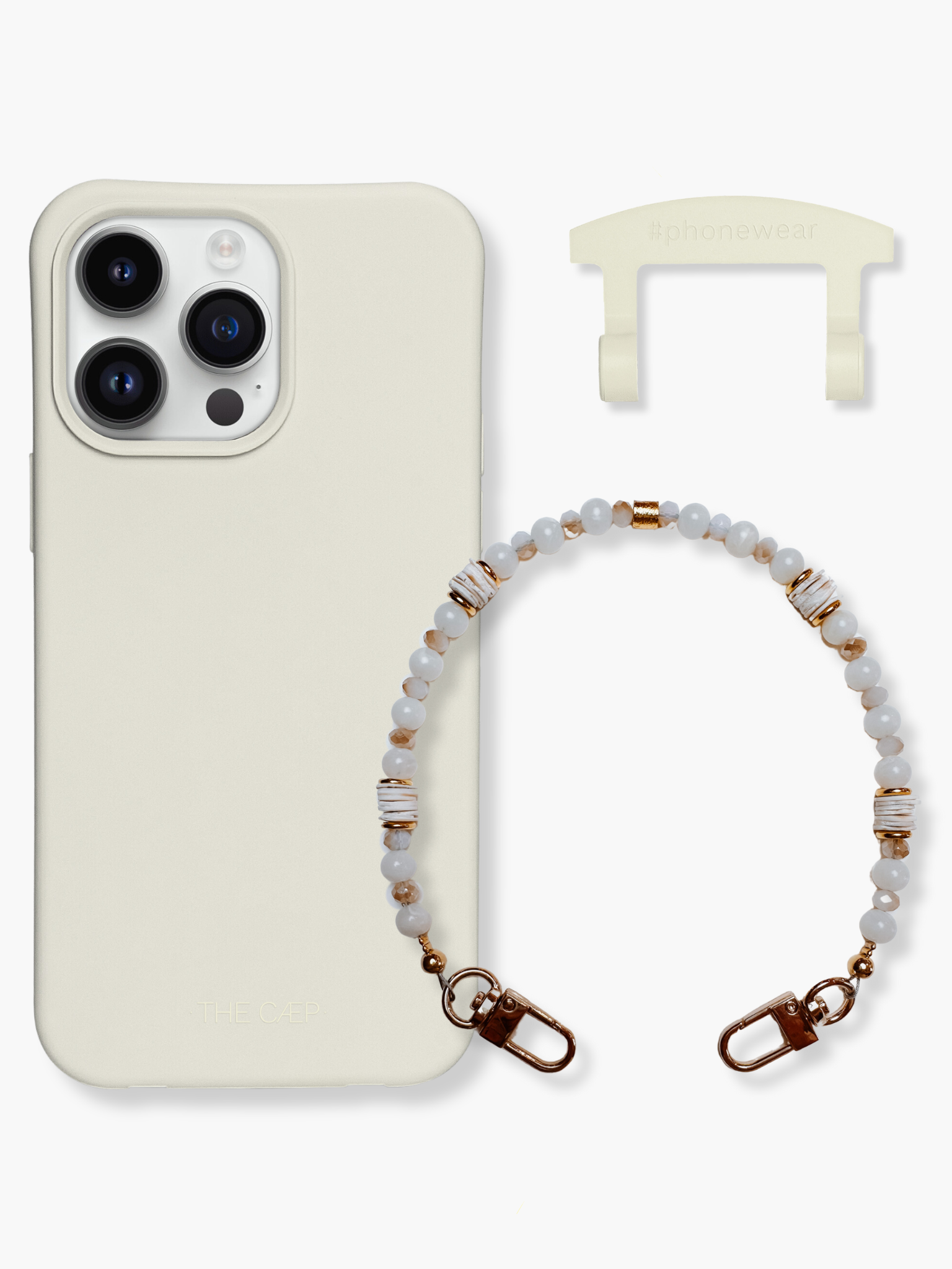This Set includes a Bondi Detach Case, a Snowe Cream Wristlet (gold or silver, with or without a round chain) and a Detach Hook.