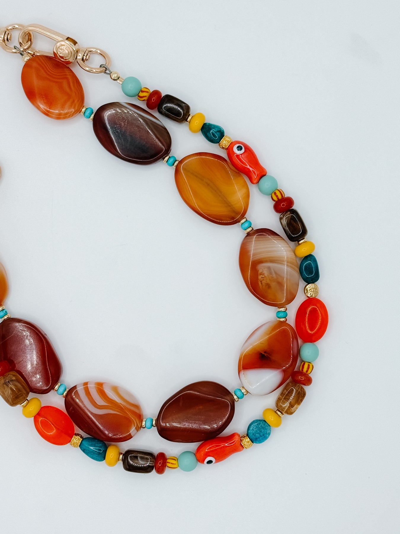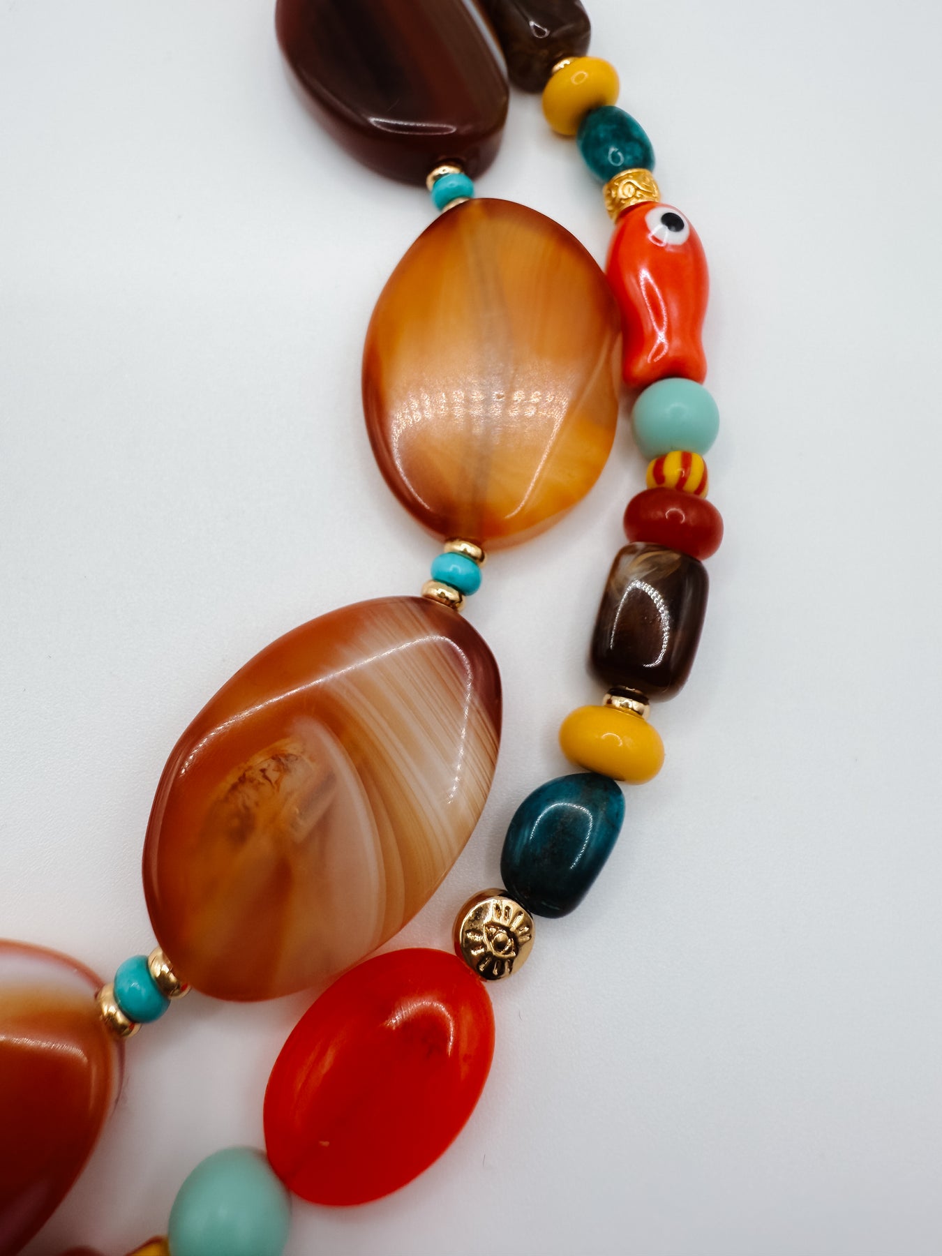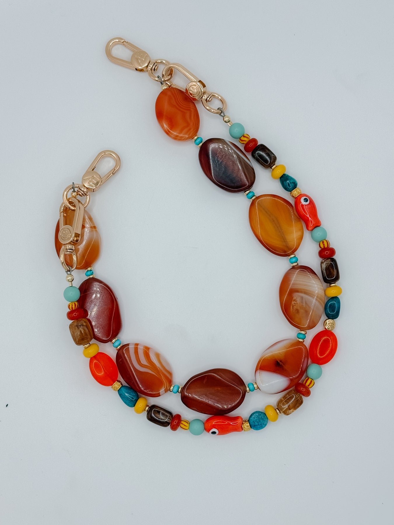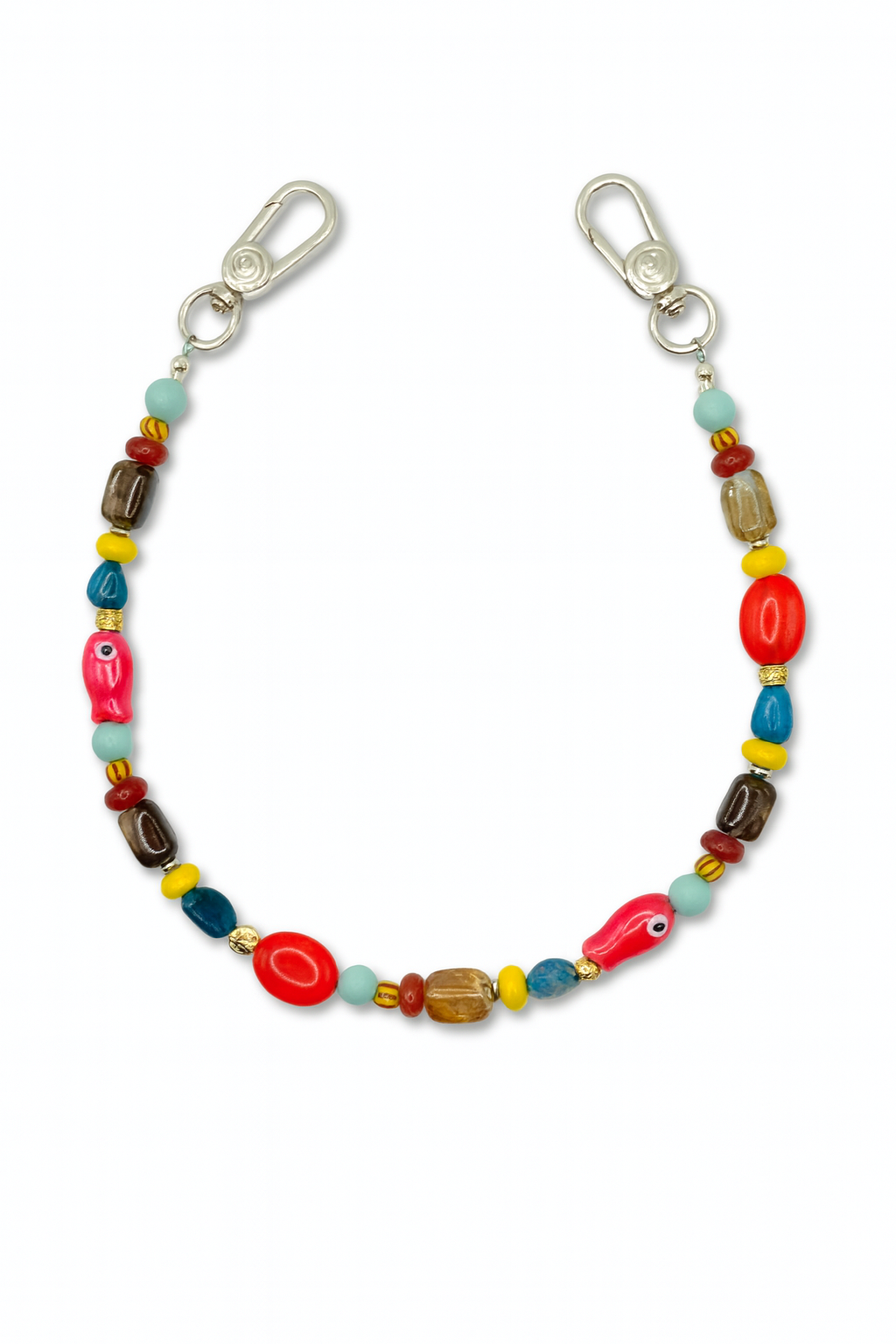 Handmade in Chatham, MA. Featuring whimsical porcelain fish beads, grounding oval jade gemstones, earthy brown rectangle beads, and playful rondelle jade. details, it captures both land and sea in one piece. Splashes of deep blue from apatite oval gemstones, striped glass accents, and a protective gold or silver evil eye bead bring layers of texture and meaning. A joyful mix of color and symbolism, this wristlet is a reminder of carefree days by the water — bold, eclectic, and full of life.