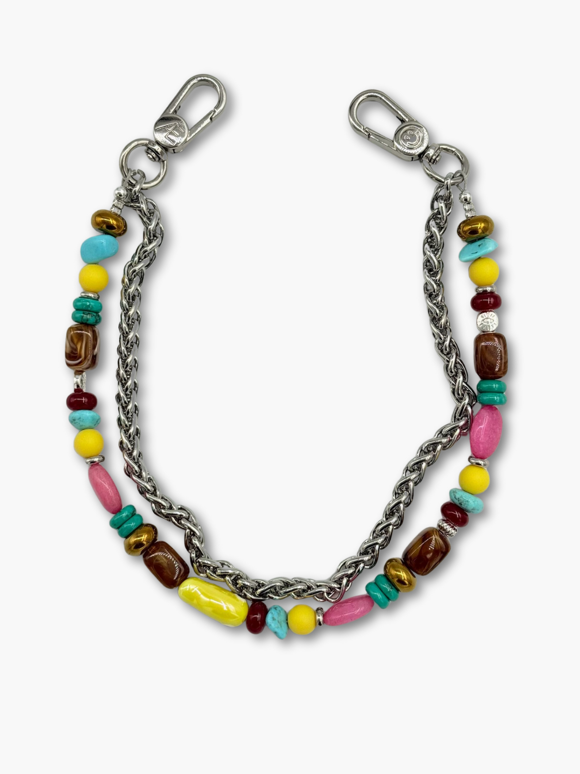 Handmade in Chatham, MA, Cabo is a playful blend of bold color and natural detail. Featuring oval pink jade beads, natural turquoise disks, sunny yellow rondelles, and a porcelain fish bead for a whimsical touch, it’s accented with brass and Turkish gold-plated spacers plus a subtle evil eye for a hint of charm. A statement piece designed to carry your essentials hands-free while adding a splash of joy to your look.