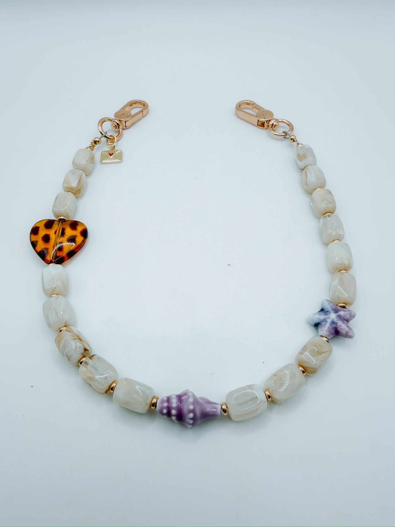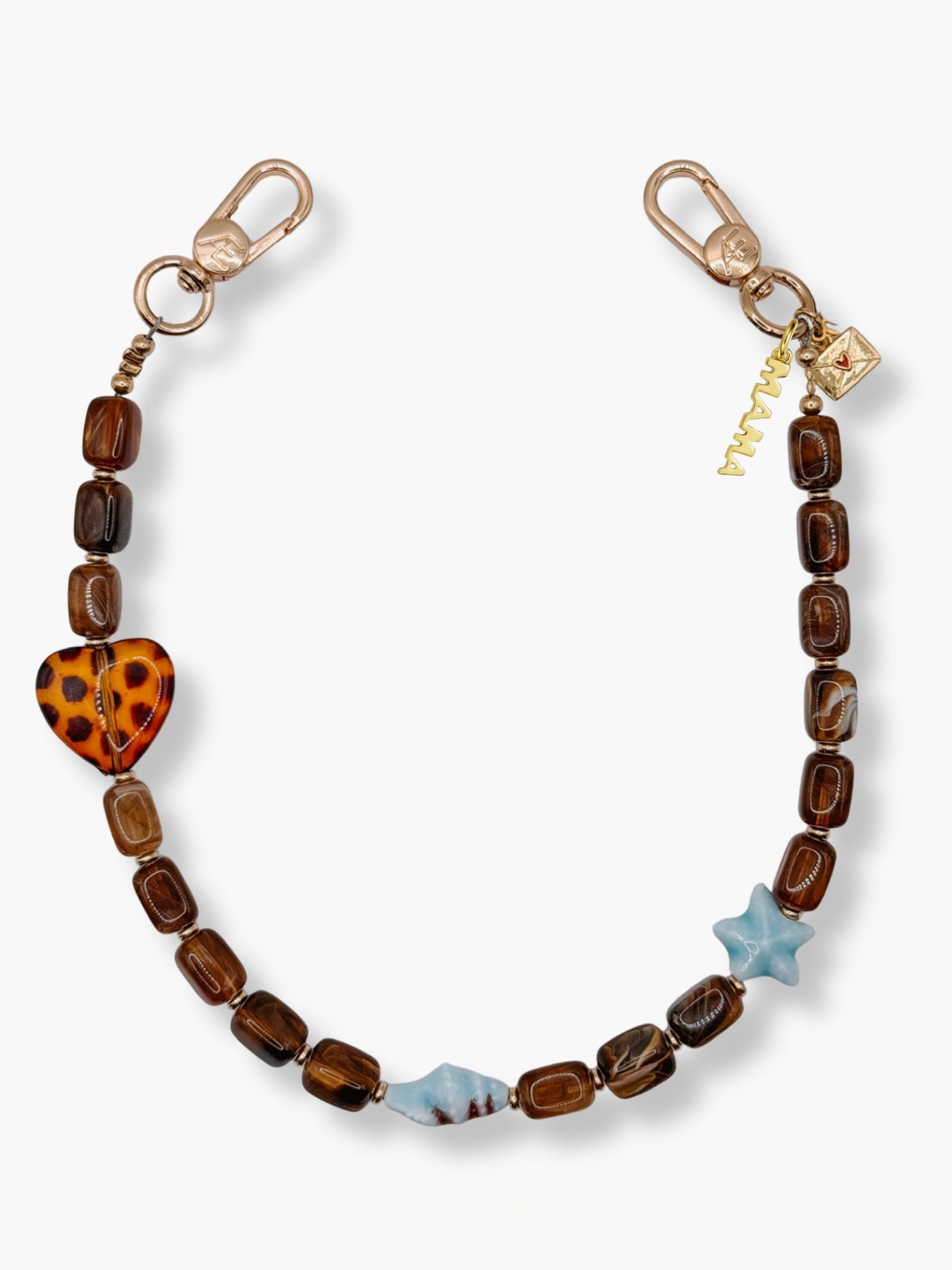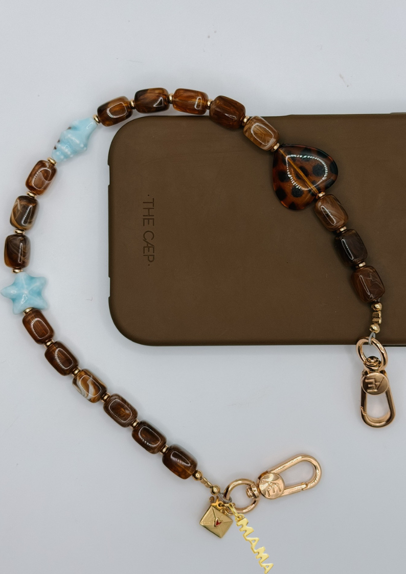 Kiki is built around rich, earthy tones with glossy brown or soft beige glass beads, paired with unexpected ocean details. Like the carved shell and star accents that break it up just enough. The leopard heart adds that signature CÆP edge, keeping it from feeling too classic.