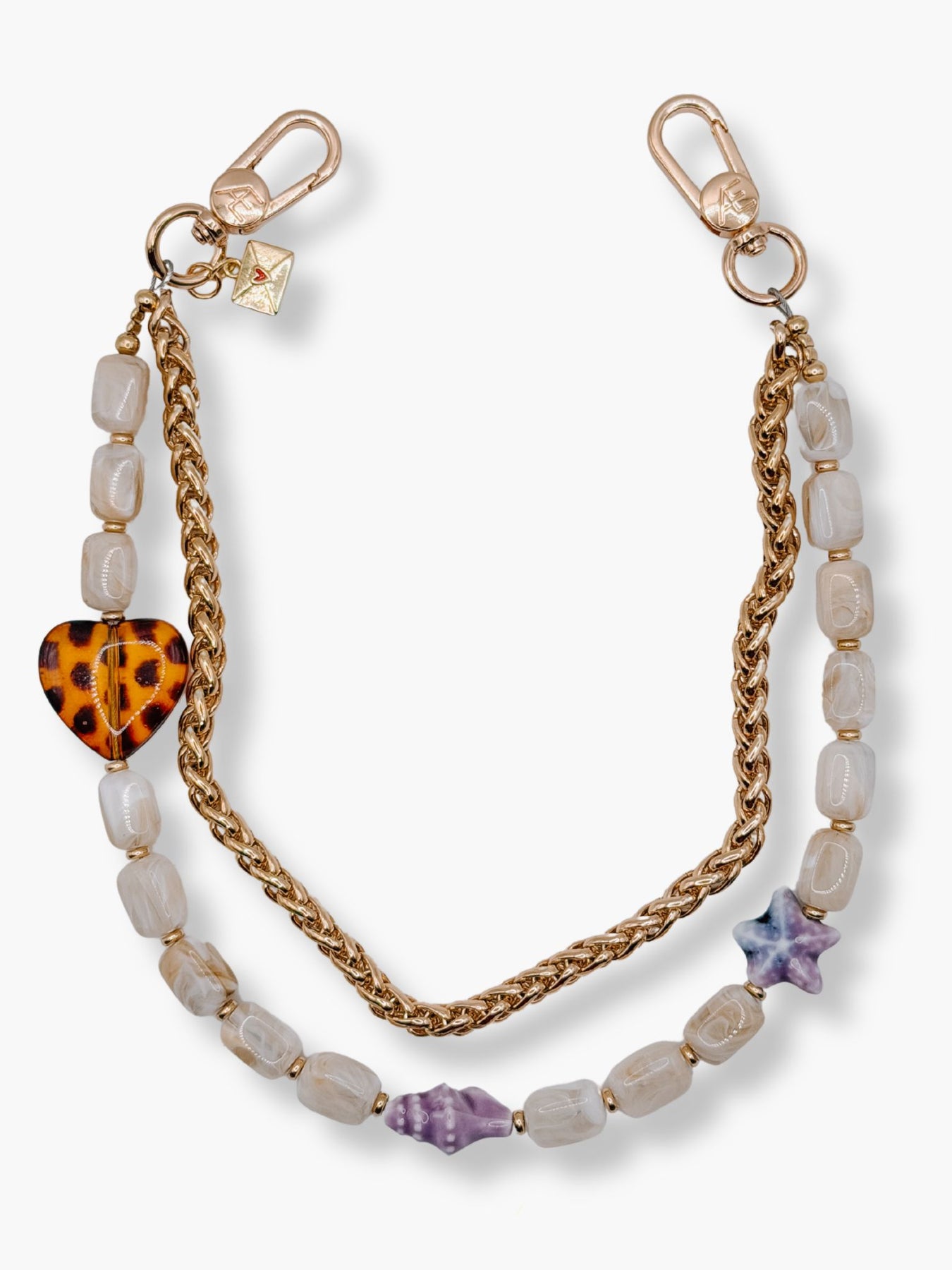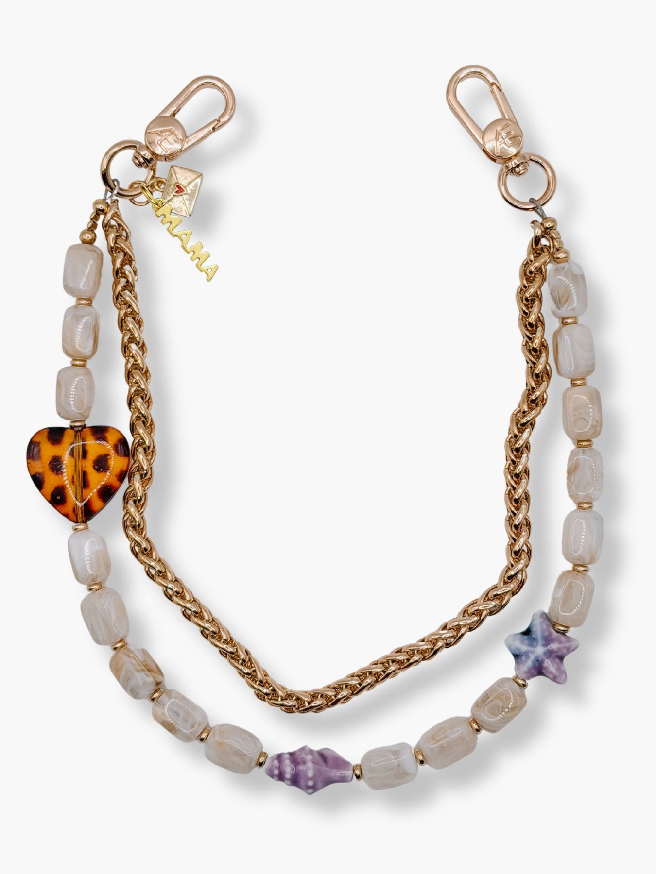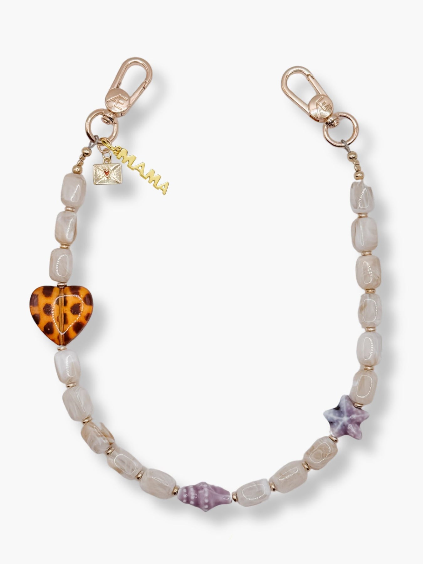 Kiki is built around rich, earthy tones with glossy brown or soft beige glass beads, paired with unexpected ocean details. Like the carved shell and star accents that break it up just enough. The leopard heart adds that signature CÆP edge, keeping it from feeling too classic.