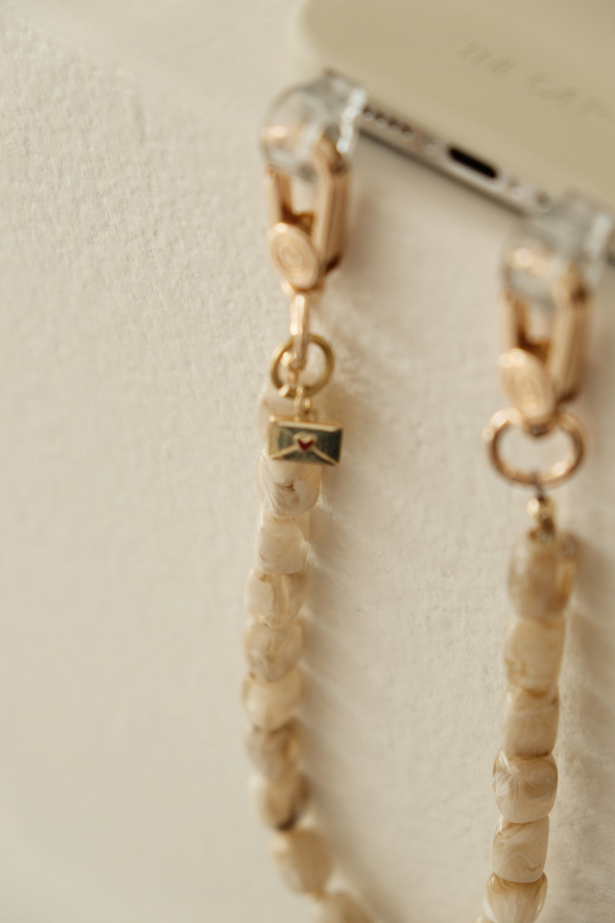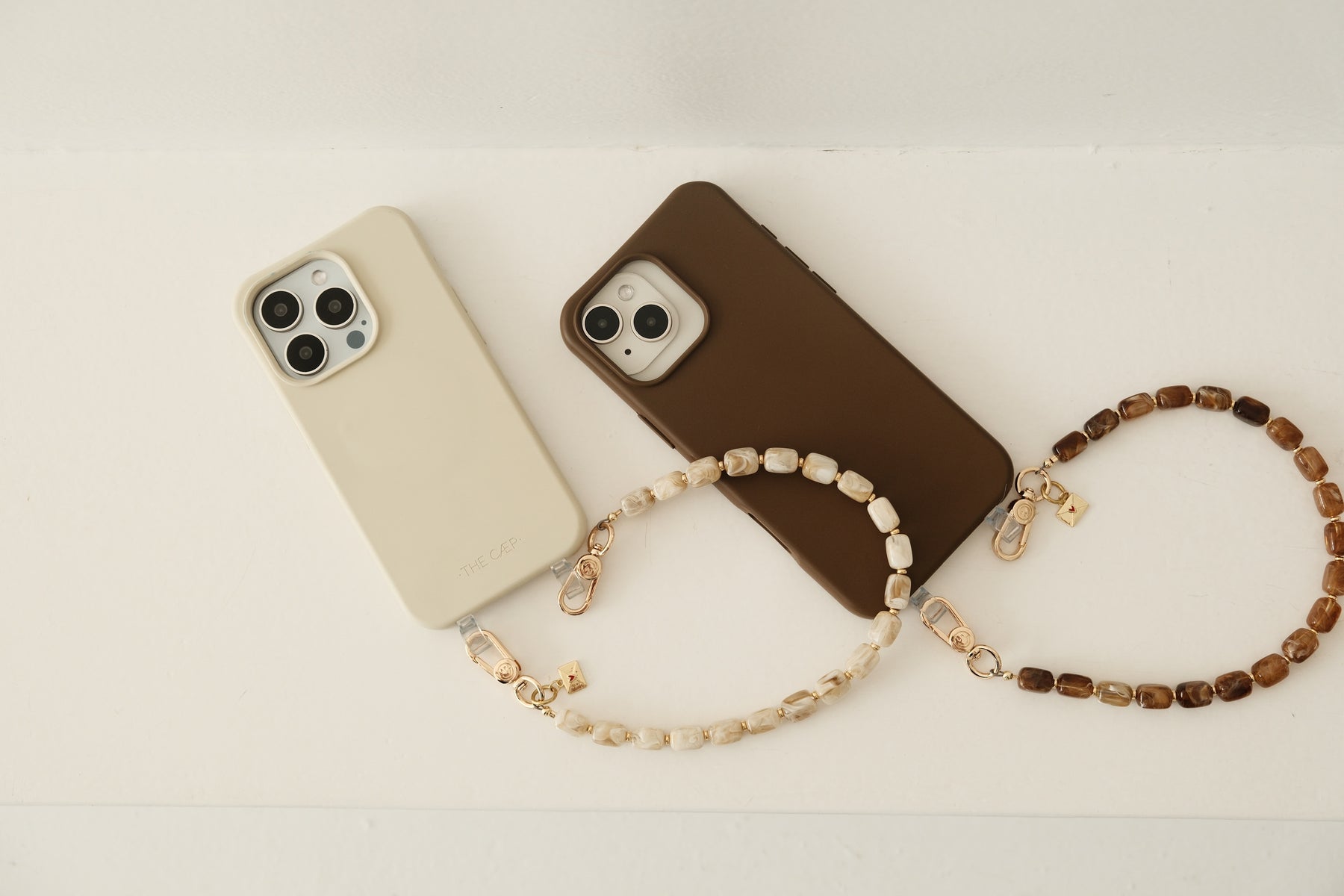 The Latte case is crafted from flexible yet durable TPU with a smooth, velvety finish and features a shock-absorbing inner pad for everyday protection. The Brune wristlet is handmade with glossy, freeform beads in soft milky and warm brown tones. Each bead slightly different, making every wristlet one of a kind.
