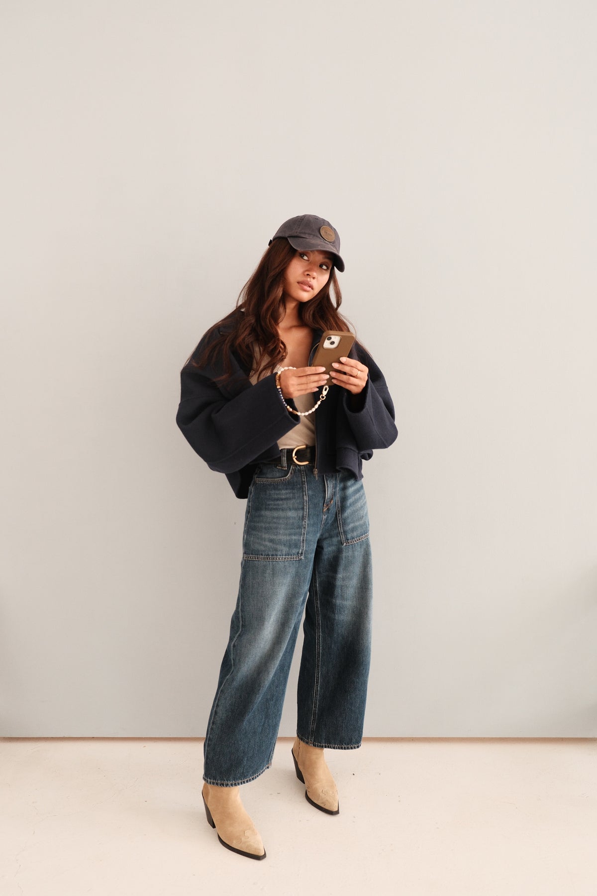 The Montana case is crafted from flexible yet durable TPU with a smooth, velvety finish and a shock-absorbing inner pad for reliable everyday protection. The Solea wristlet is handmade with a rich mix of white freshwater pearls, caramel-toned glass beads, and deep navy accents. Every wristlet is slightly different in shape and tone, making each piece truly one of a kind.