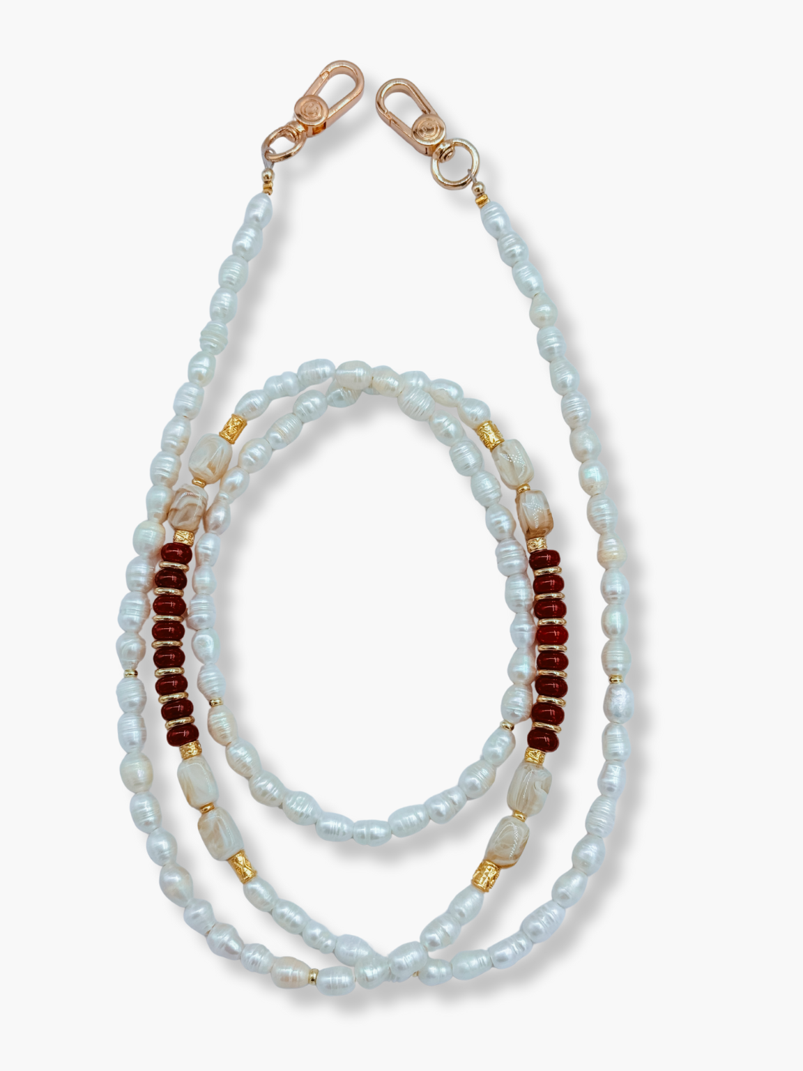 Handmade in Chatham, MA, Ivy is about 14–15 inches long and crafted with ethically sourced beads. It features luminous freshwater pearls paired with warm-toned beige rectangle beads, and rich red jade rondelles, and golden spacer disks for a touch of shine.