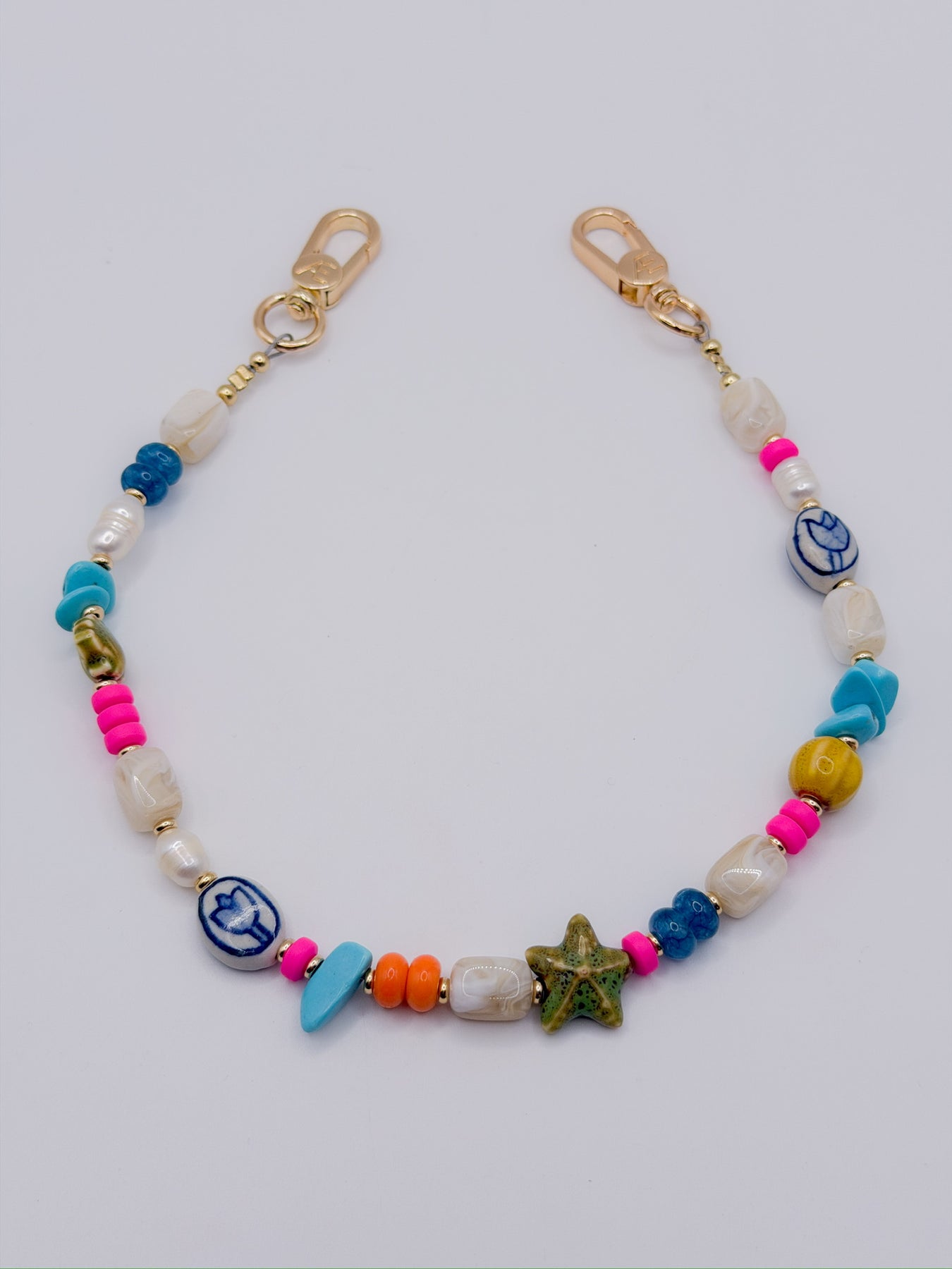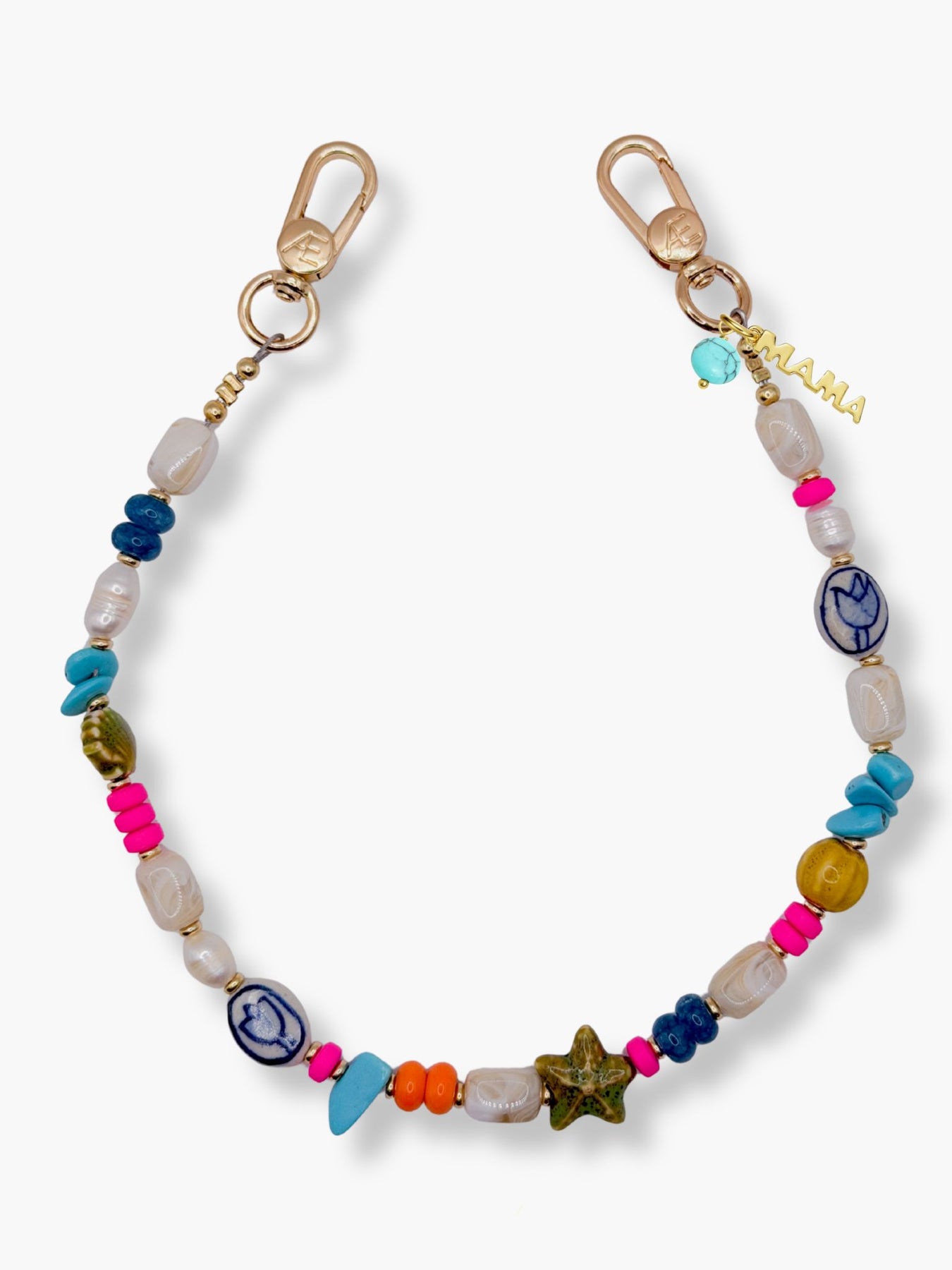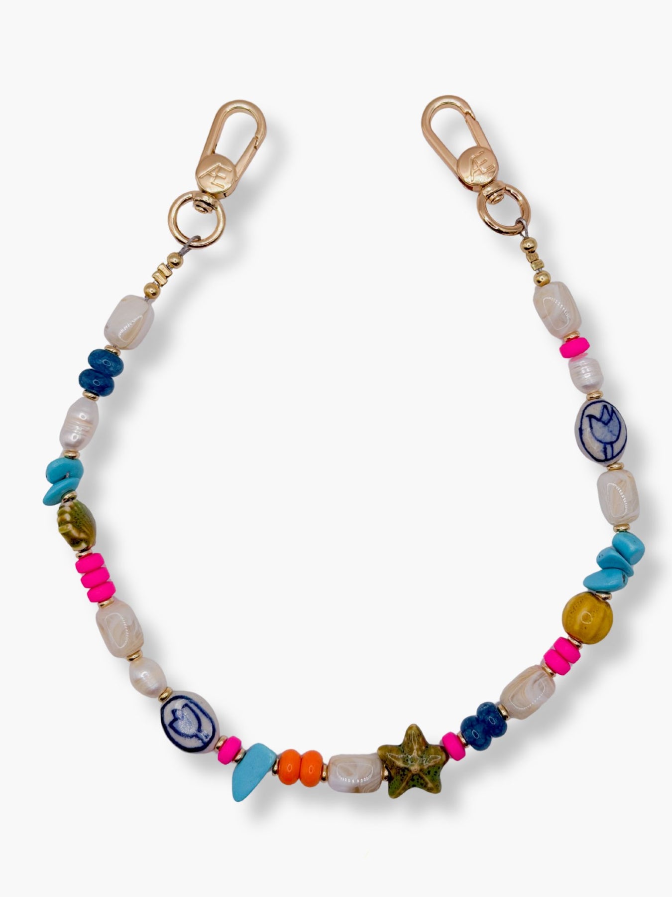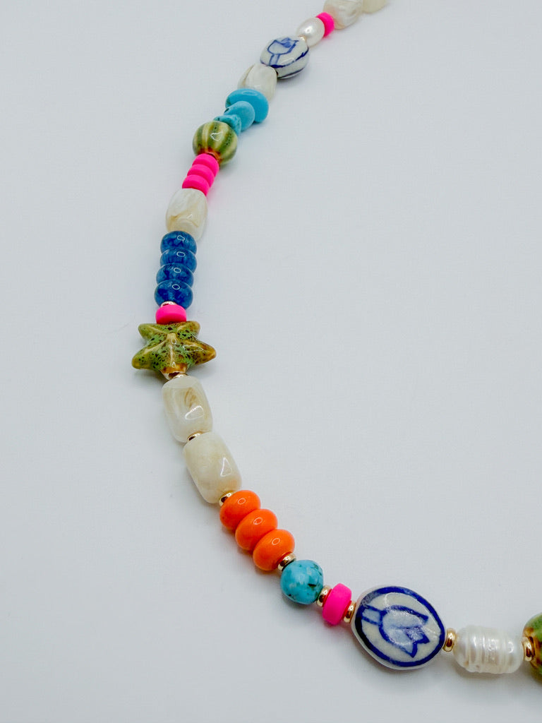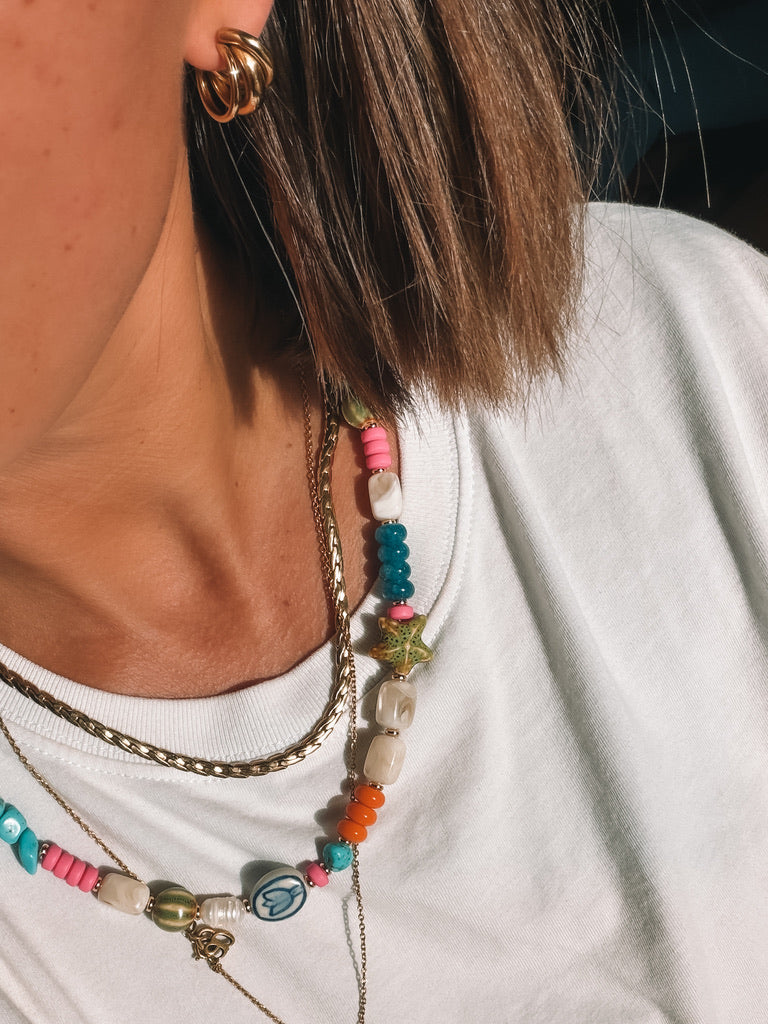 Lilo brings together soft neutrals with pops of ocean blue and neon; finished with playful ceramic details like the hand-painted tulip beads and a subtle star accent. It’s that effortless mix of calm and color that works with everything, but never feels boring.