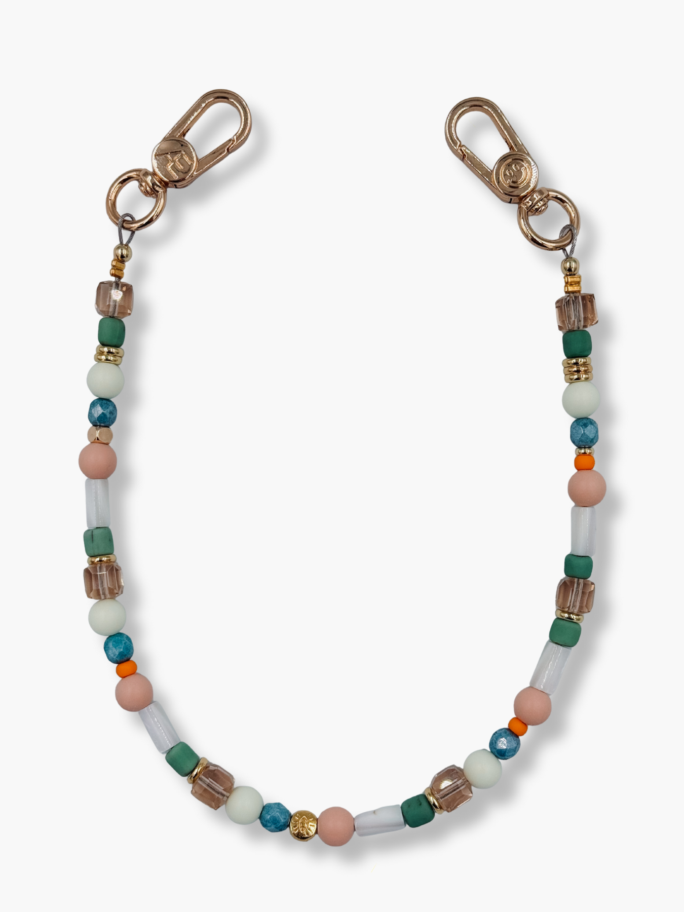 Meadow combines soft pastels and earthy tones, creating a calming, sophisticated look. The blend of orange, green, blue, pearl tubes and gold/silver accents adds an elegant touch, perfect for anyone looking to elevate their phone accessory.