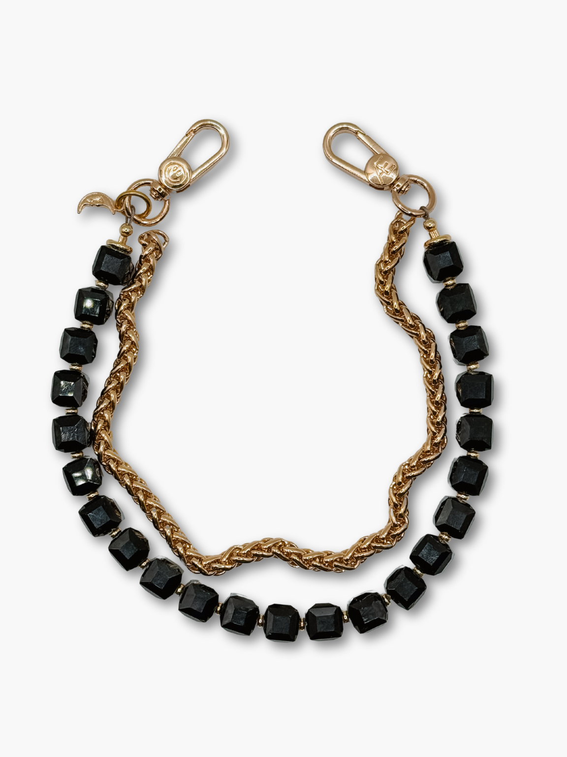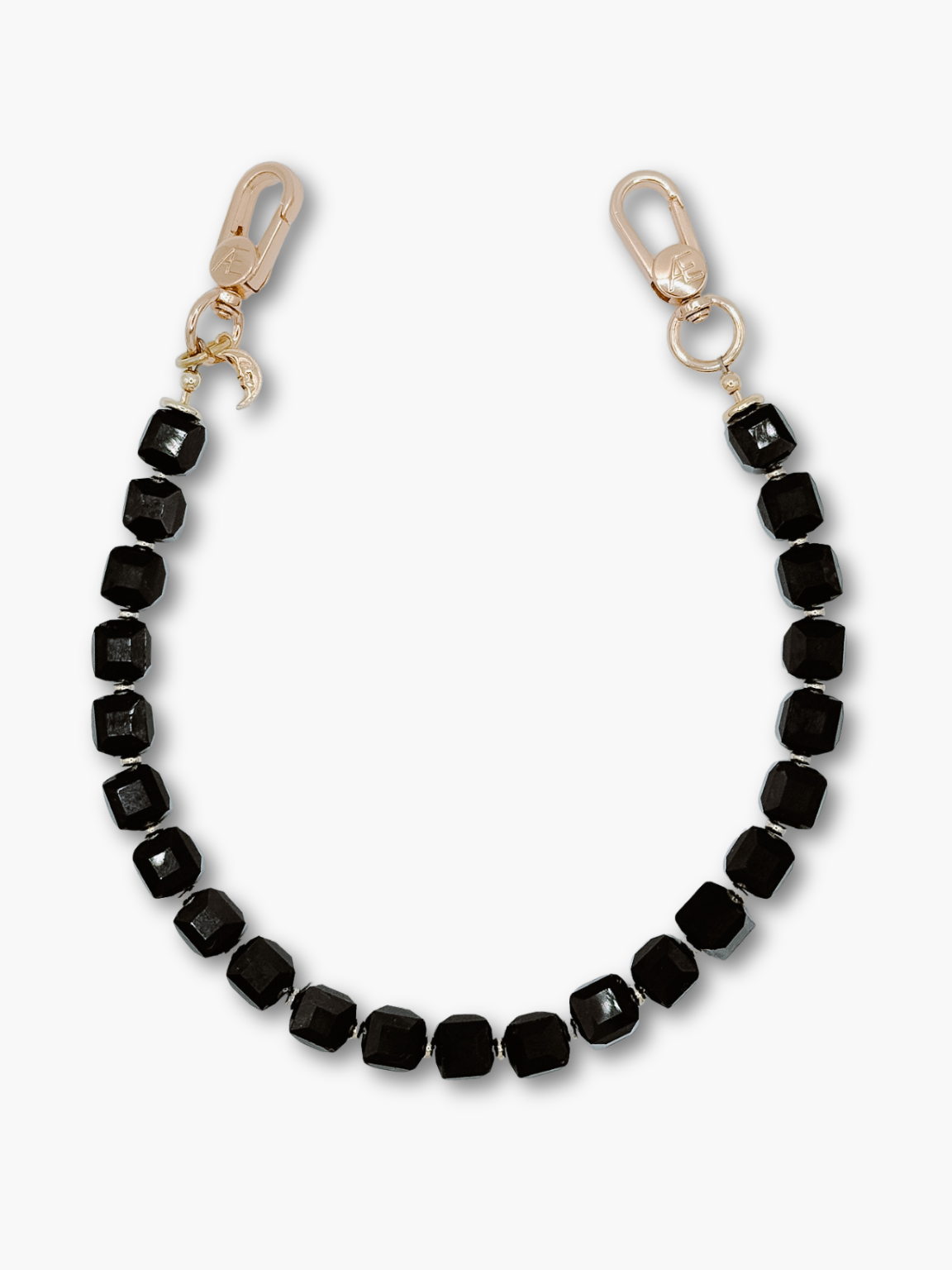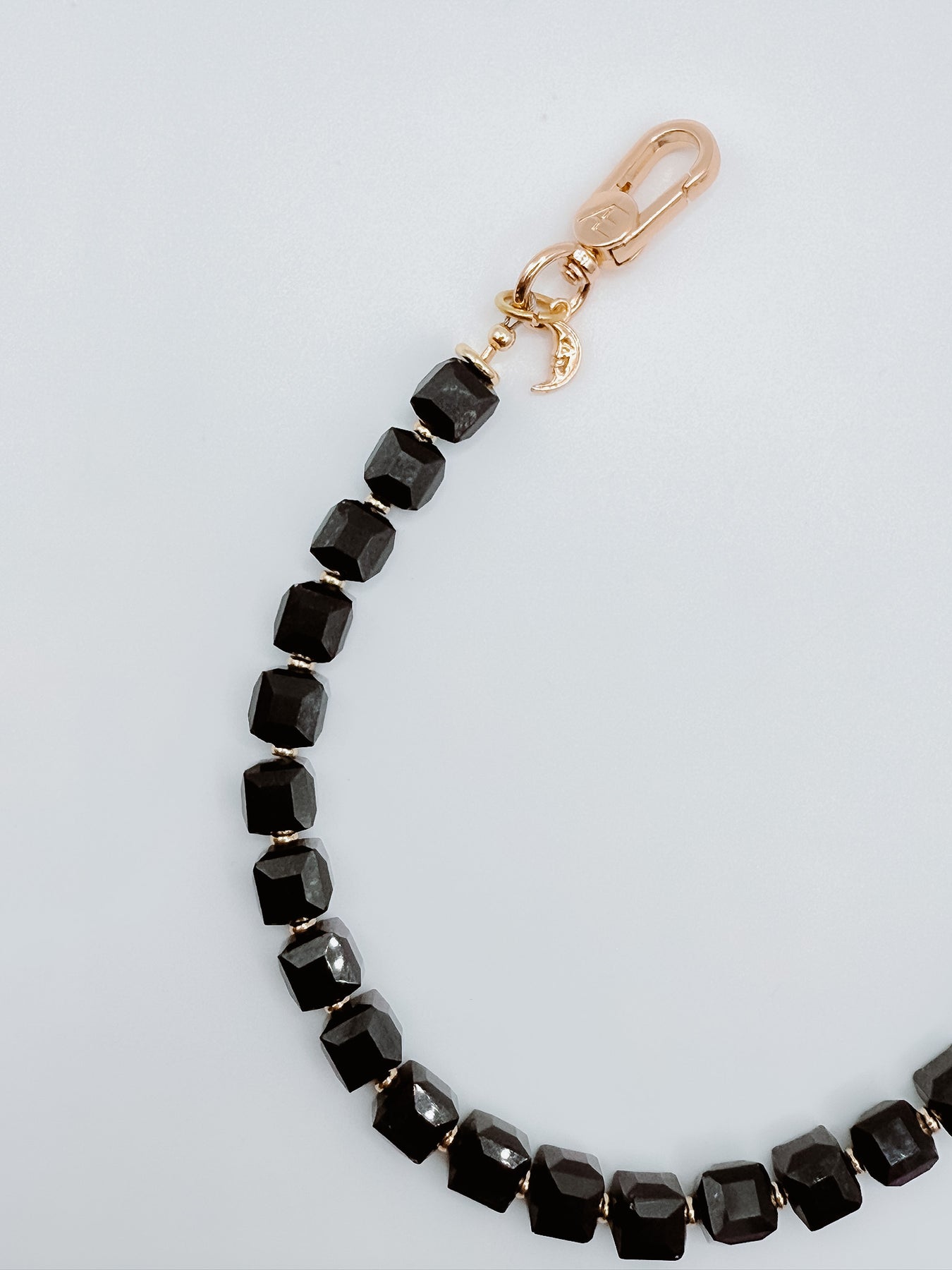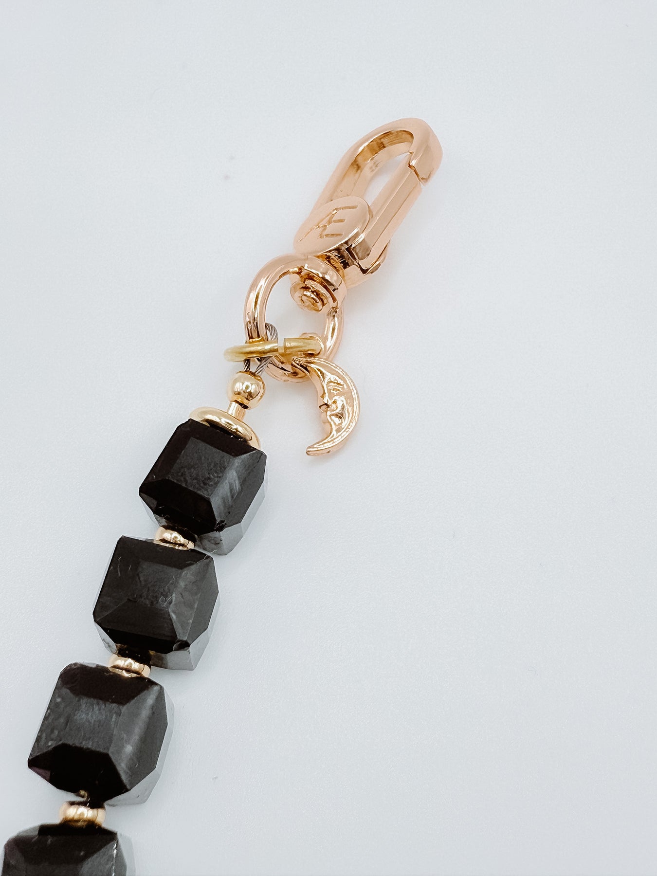 Sleek and celestial, this wristlet is strung with bold black square-cut glass beads, finished with delicate gold-plated spacer disks and a dainty moon charm. Minimal yet statement-making, it carries a subtle cosmic energy — perfect for elevating your everyday essentials with a touch of mystery and shine. Handmade in small batches for a piece that feels truly yours.