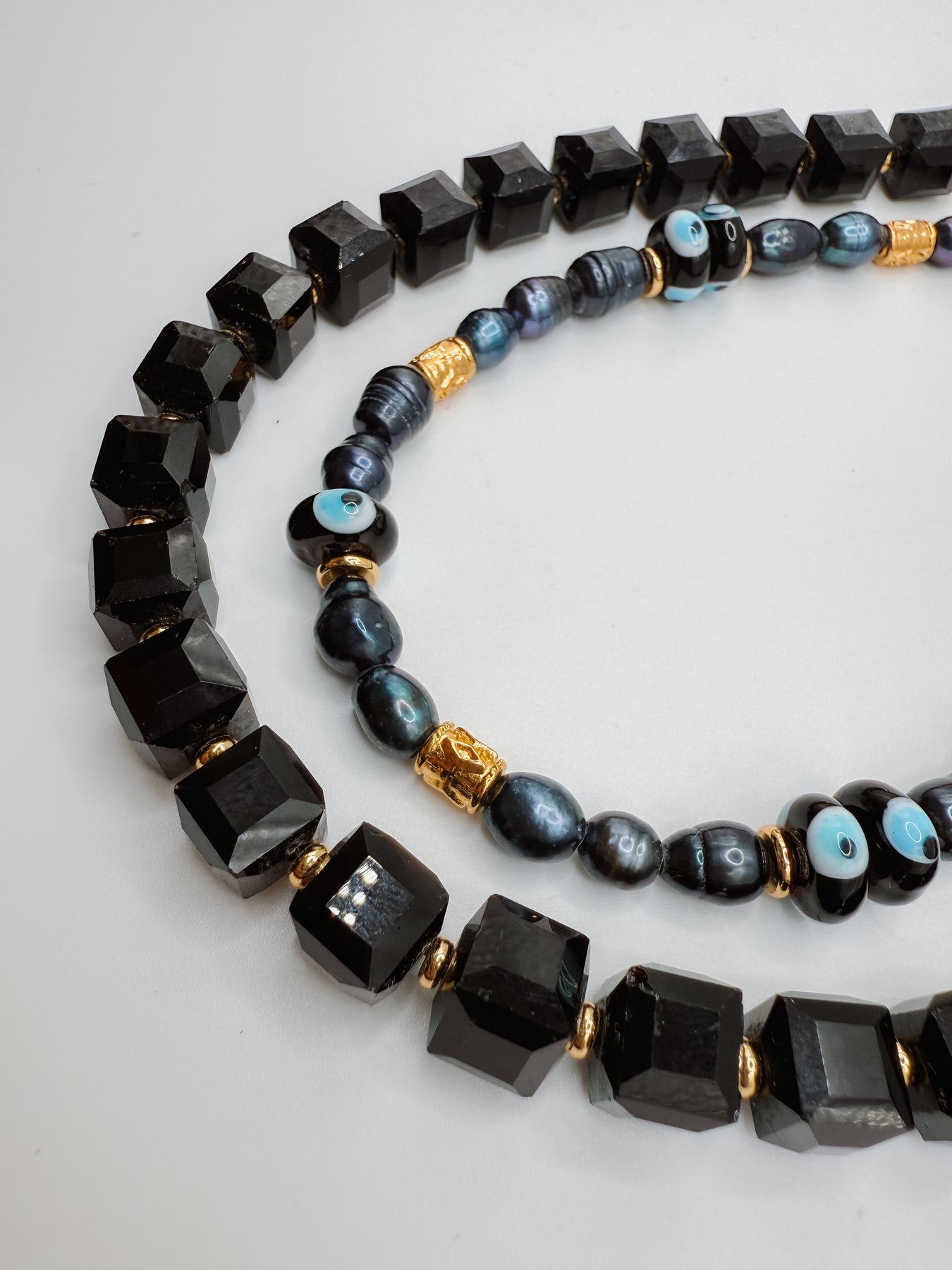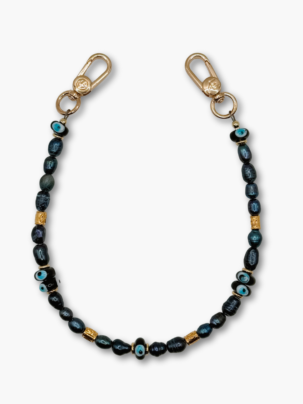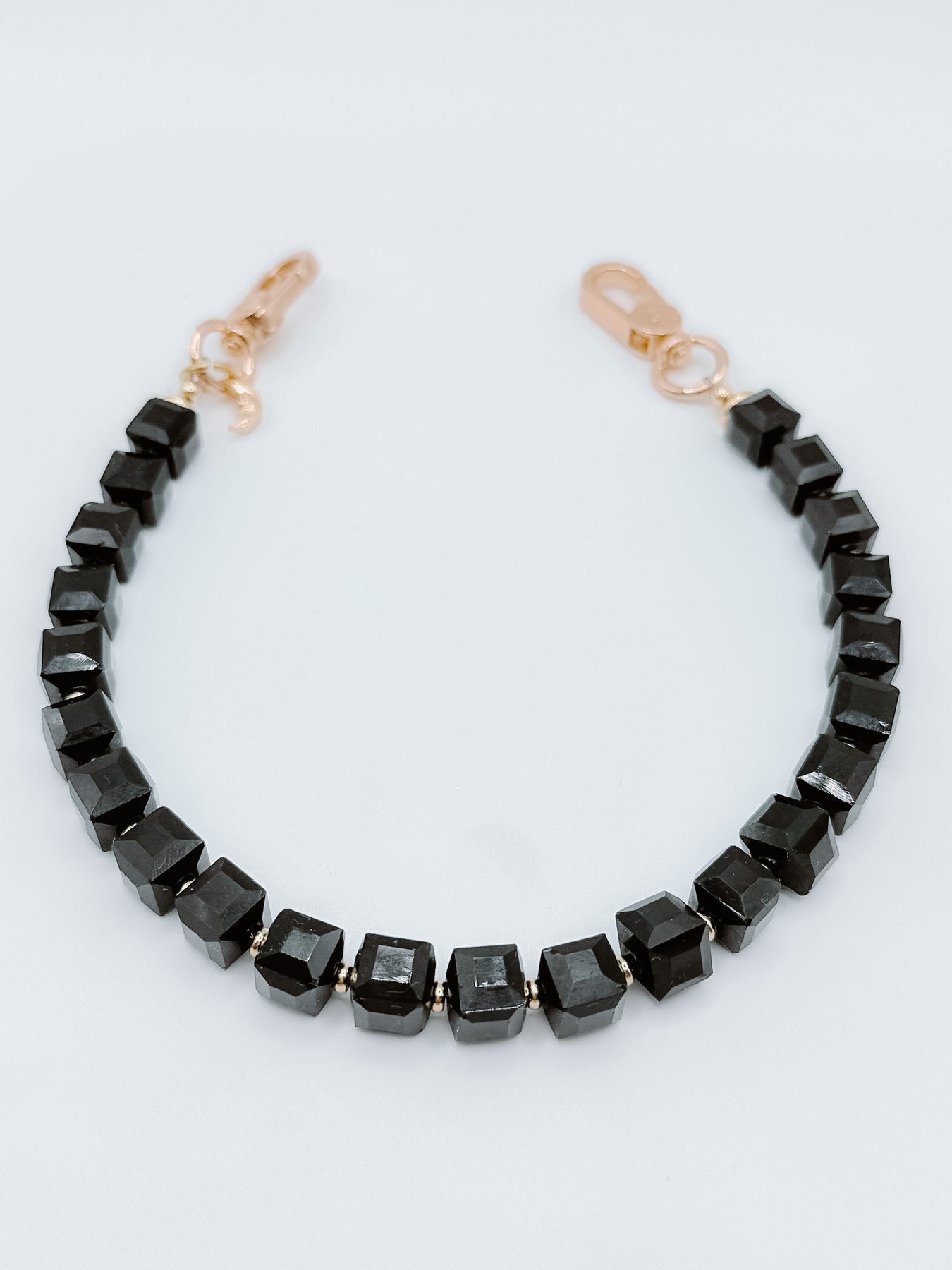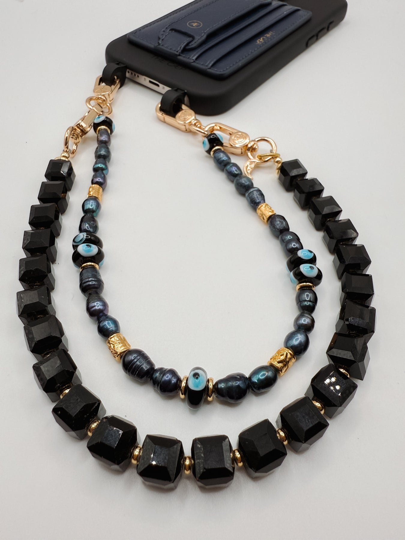 Sleek and celestial, this wristlet is strung with bold black square-cut glass beads, finished with delicate gold-plated spacer disks and a dainty moon charm. Minimal yet statement-making, it carries a subtle cosmic energy — perfect for elevating your everyday essentials with a touch of mystery and shine. Handmade in small batches for a piece that feels truly yours.