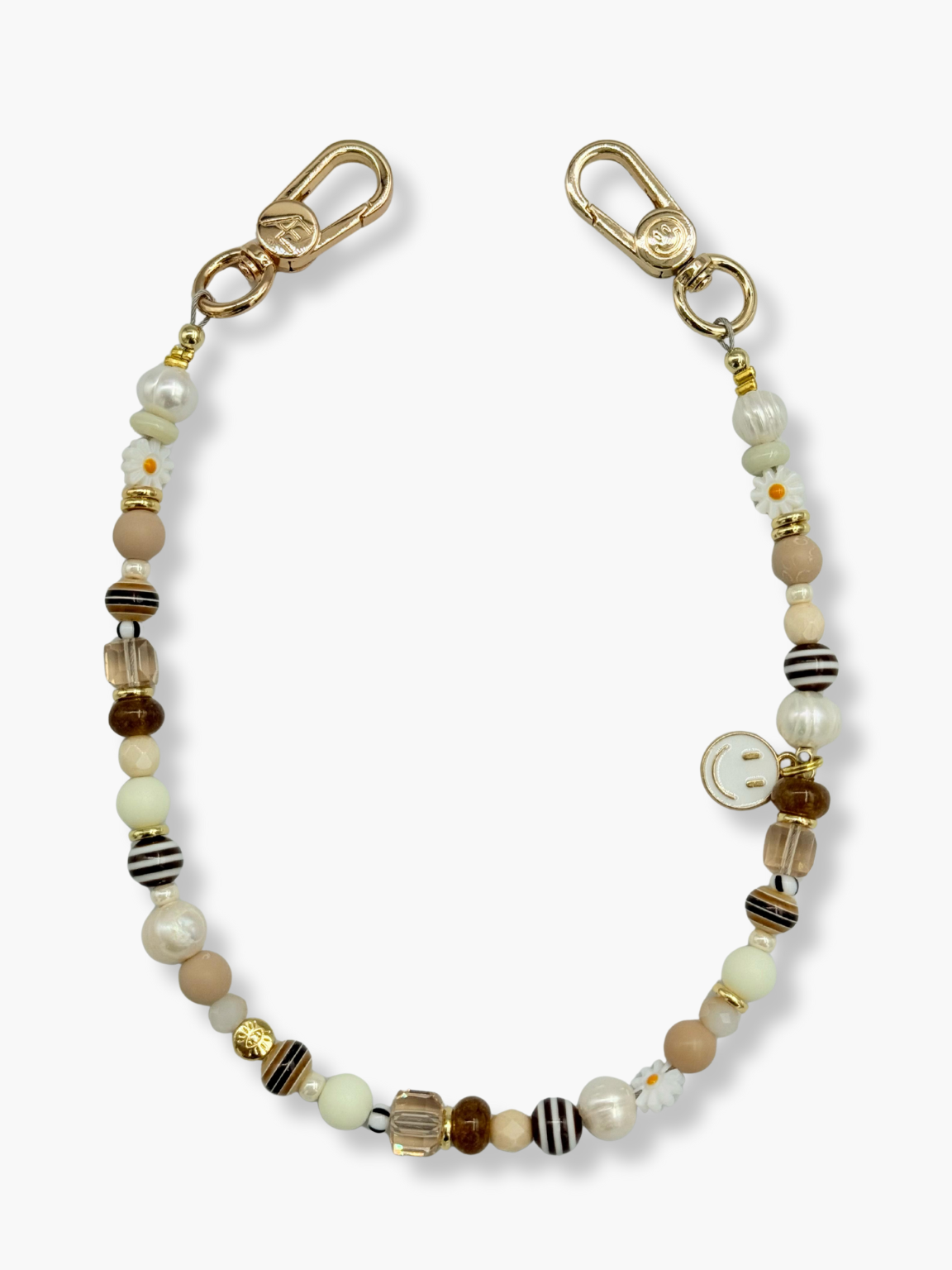 Our Phoenix Crossbody Strap, a beautifully handcrafted accessory designed to keep your phone secure while adding a touch of style to your outfit. Made with a unique blend of neutral-toned beads, including soft browns, creams, and subtle brown and white striped accents, this strap is both eye-catching and versatile. The delicate pearl flower beads and gold-plated hardware elevate the design, making it perfect for both casual and more polished looks.