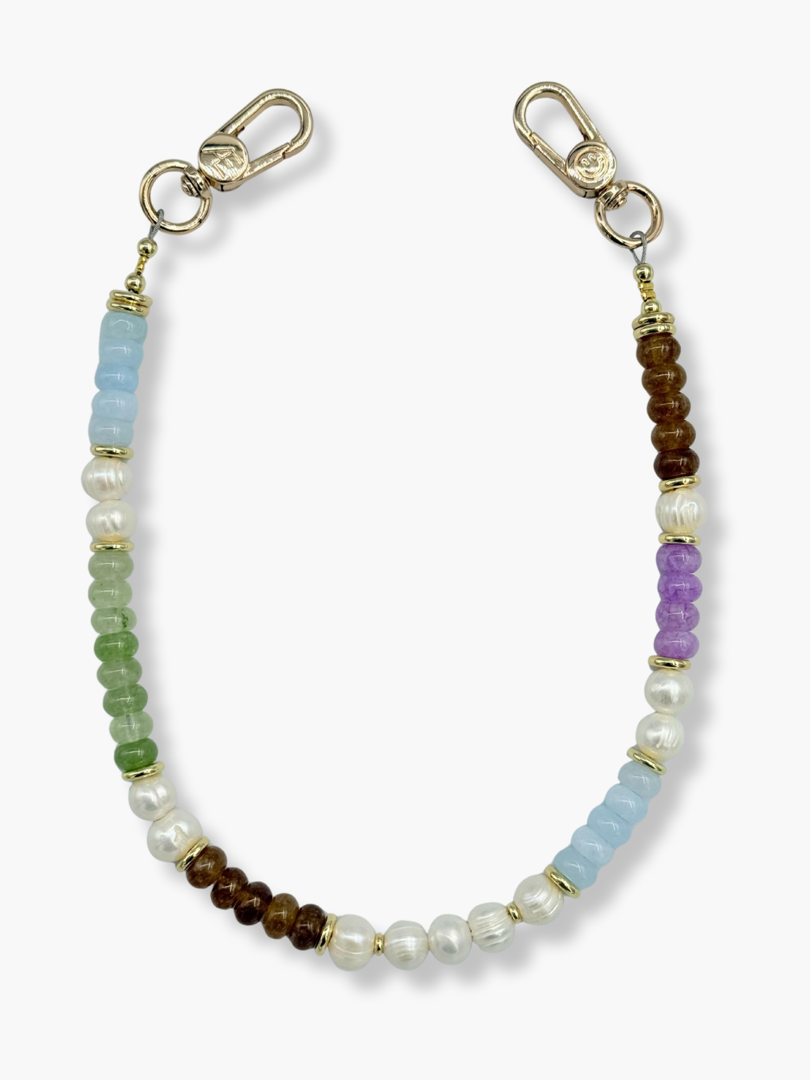 Rue is a luxurious blend of natural shaped pearls and vibrant gemstones. Available with your choice of silver or gold hardware, this elegant wristlet adds a touch of sophistication to your everyday style. Featuring a combination of rich colors and delicate pearls, Rue is not only functional but also a statement accessory, perfect for securing your phone while on the go. Whether you prefer reds and pinks or calming blues and greens, it complements any look with its timeless, gemstone elegance.