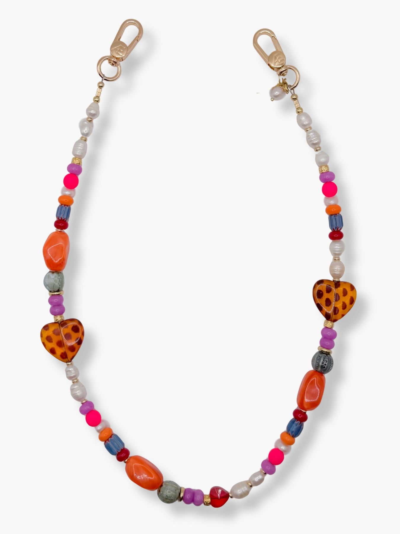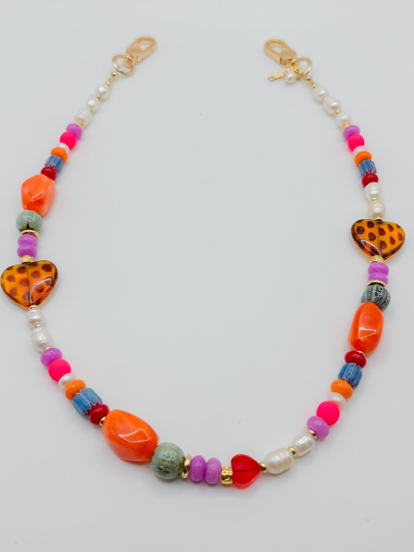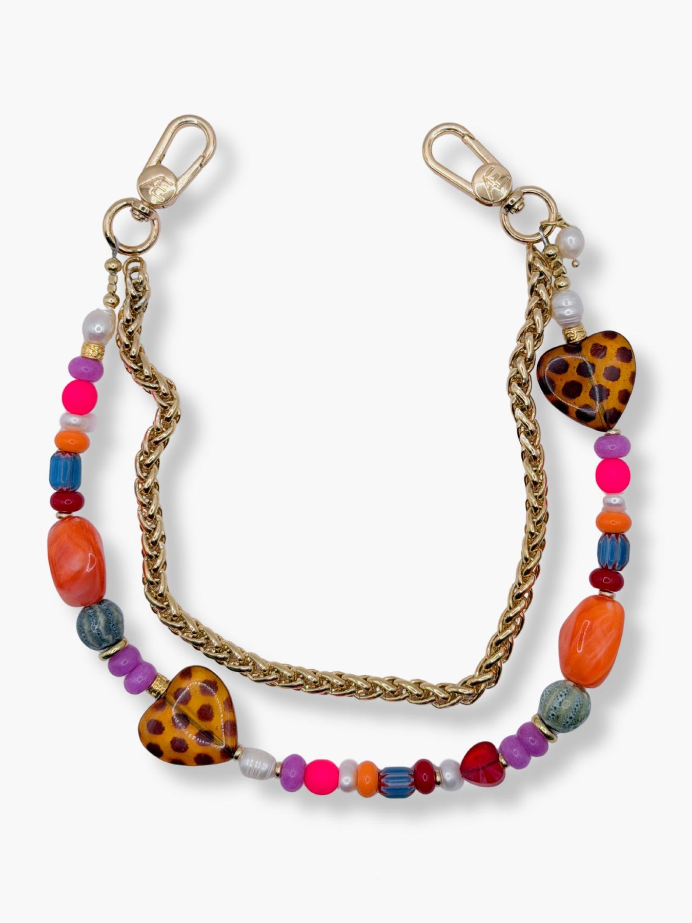 Vivi is your statement piece for days when your outfit needs something. A mix of vibrant glass beads, natural stones, and freshwater pearls comes together with our signature gold hardware and double leopard heart detail (because one simply isn’t enough). The added chain gives it that layered, jewelry-like feel. Designed to stand out without trying too hard.
