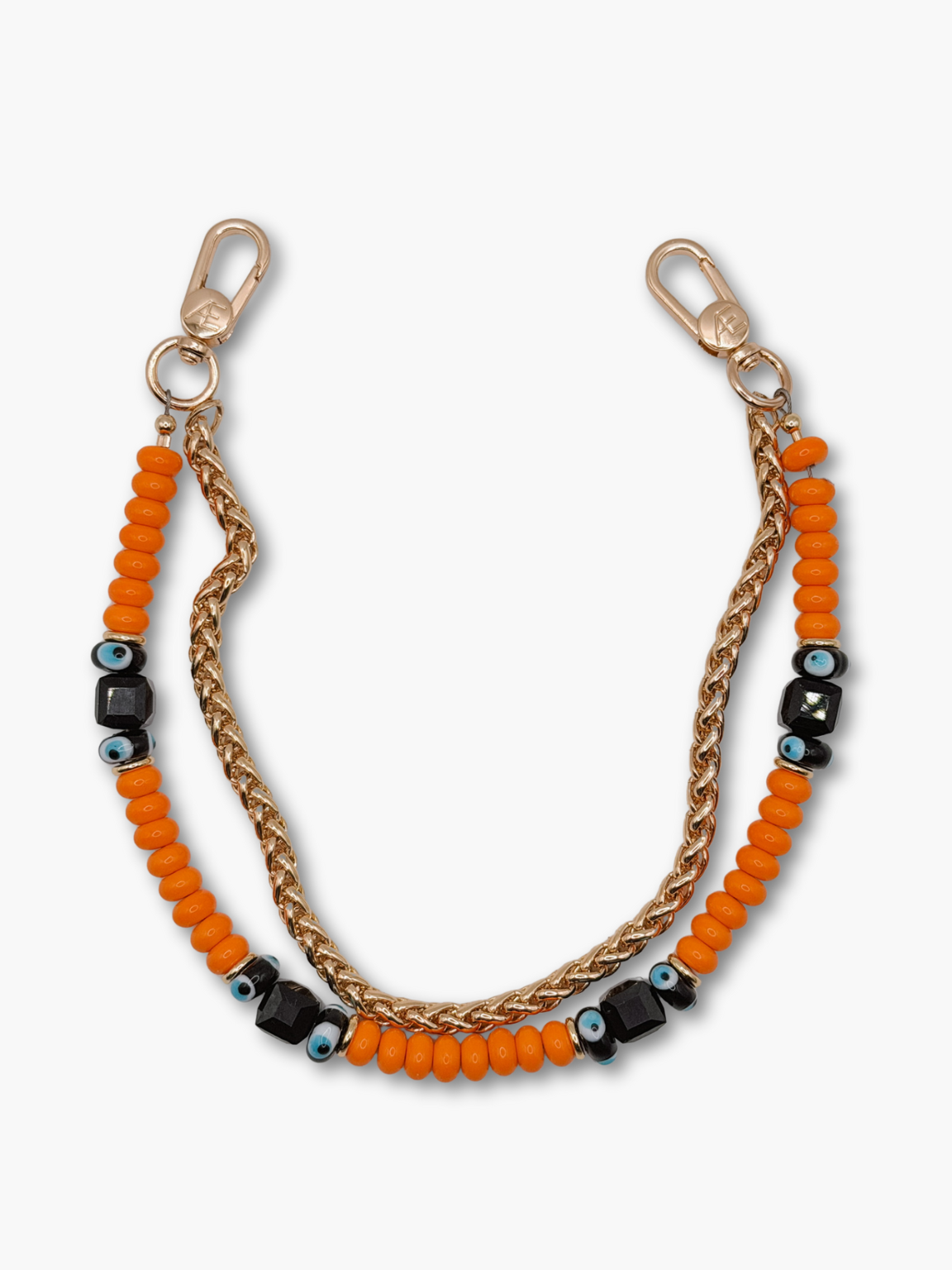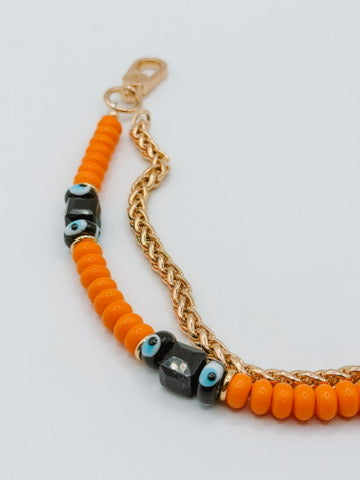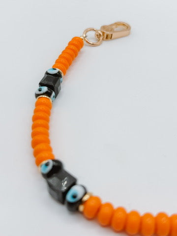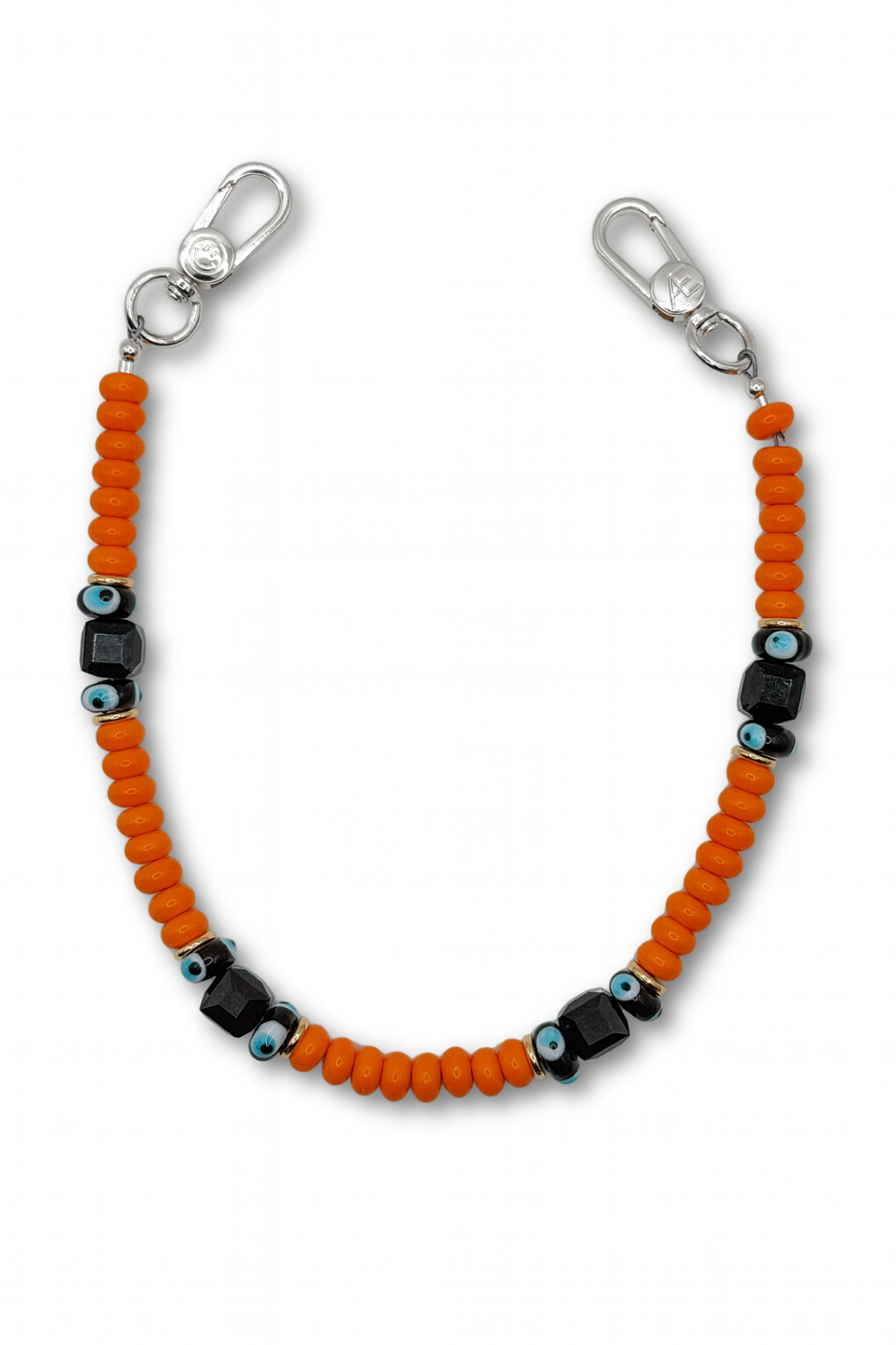 Winnie is a bold mix of deep black gemstone and bright orange glass beads — a color story inspired by autumn nights and golden city light. Hand-strung with Turkish evil-eye accents and subtle gold or silver spacers, this limited-edition piece adds an edge to your everyday carry.